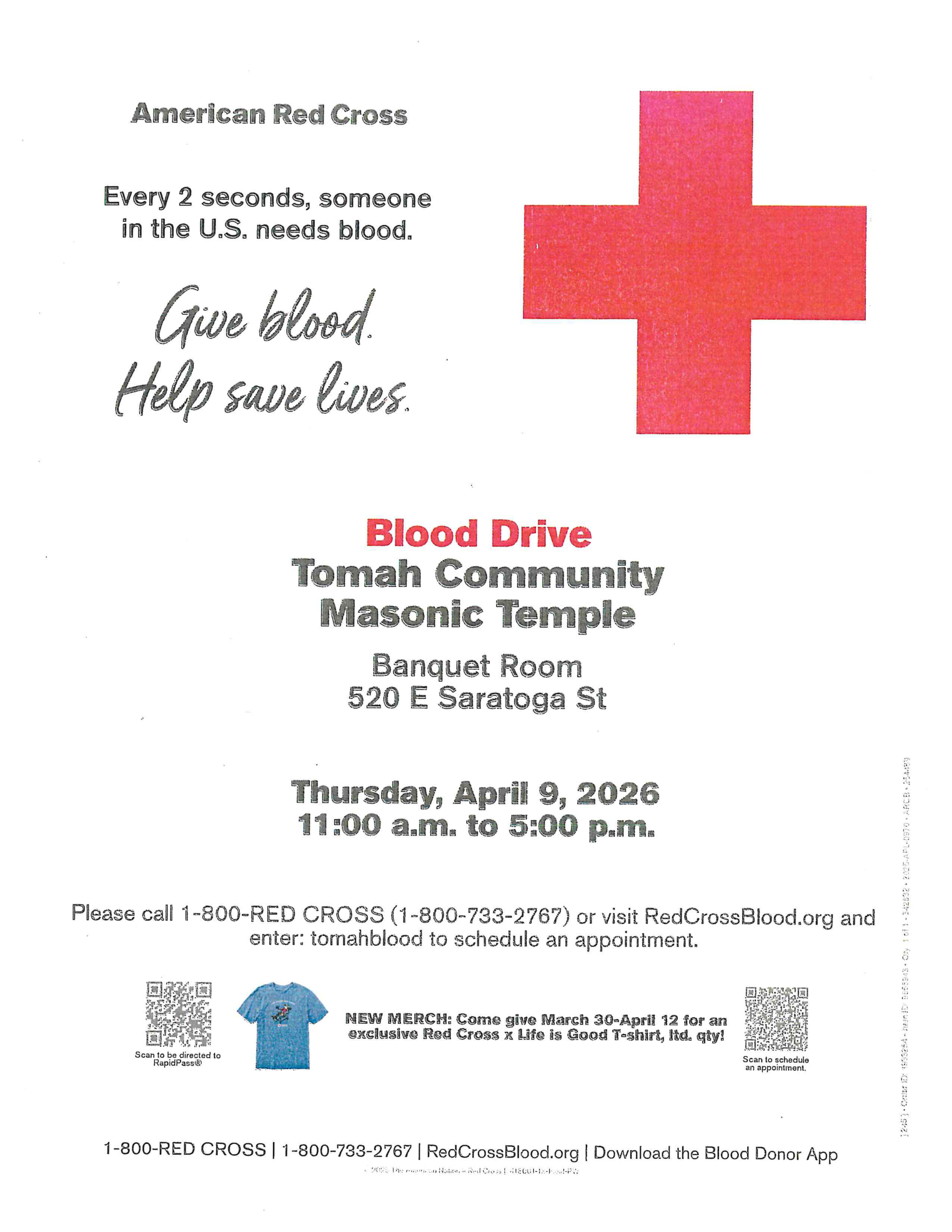 Please call 1-800-RED CROSS (1-800-733-2767) or visit RedCrossBlood.org and enter: tomahblood to schedule an appointment.