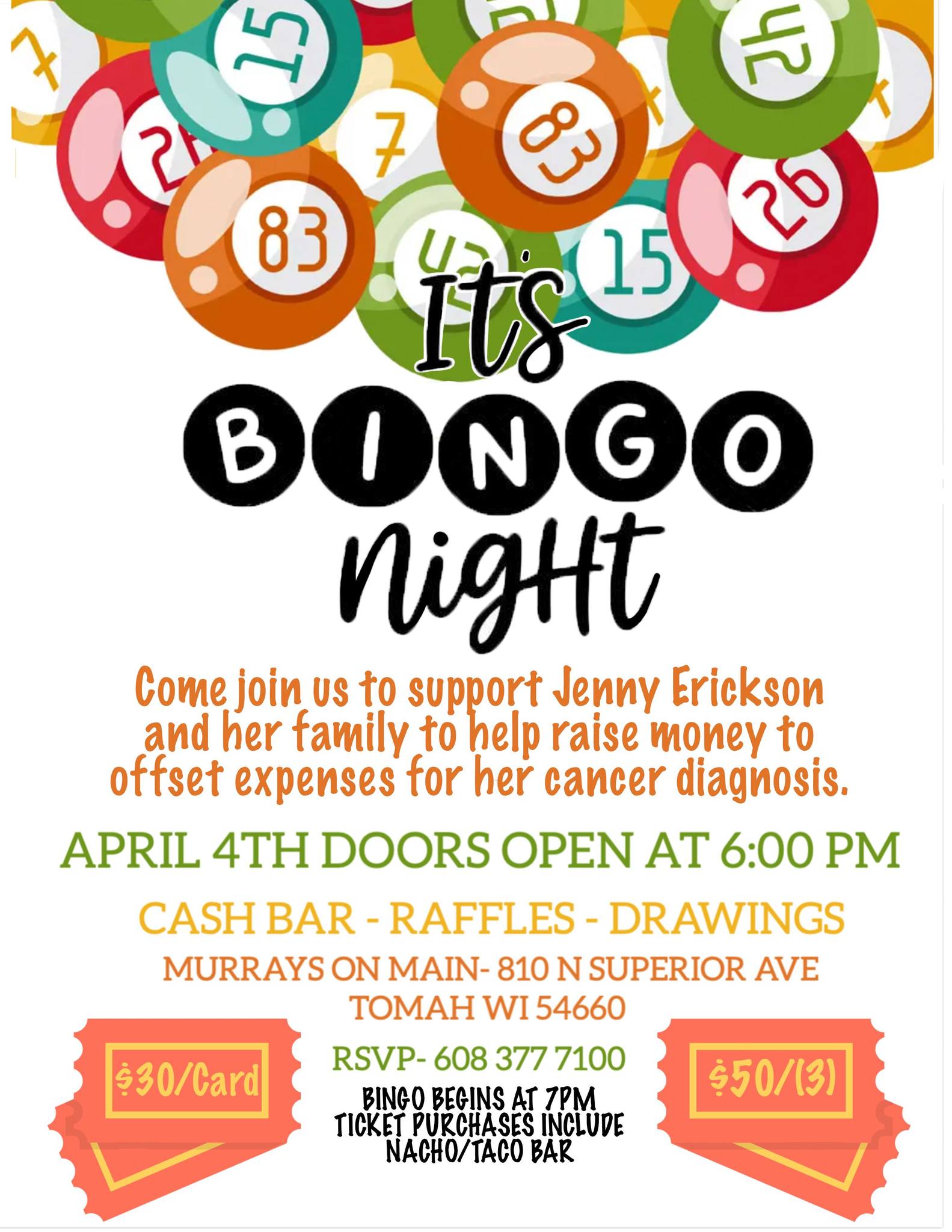 Join us for a fun and meaningful evening at Bingo Night as we come together to support Jenny Erickson and her family. This special fundraiser aims to help offset expenses related to her cancer diagnosis, and your participation can make a real difference.