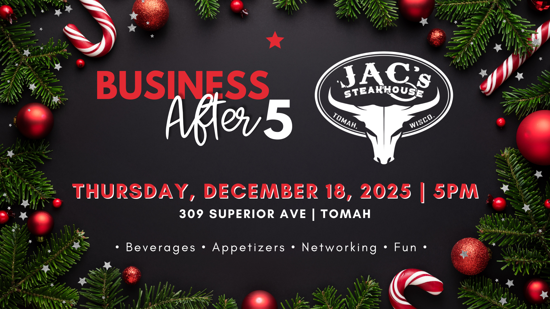 Join the Tomah Chamber for a Business After 5 networking event hosted by JAC’s Steahouse restaurant on Thursday, December 18, 2025, at 5pm.  You’re invited to drop-in for beverages, appetizers, networking, and fun!  It’s going to be a jolly good time!