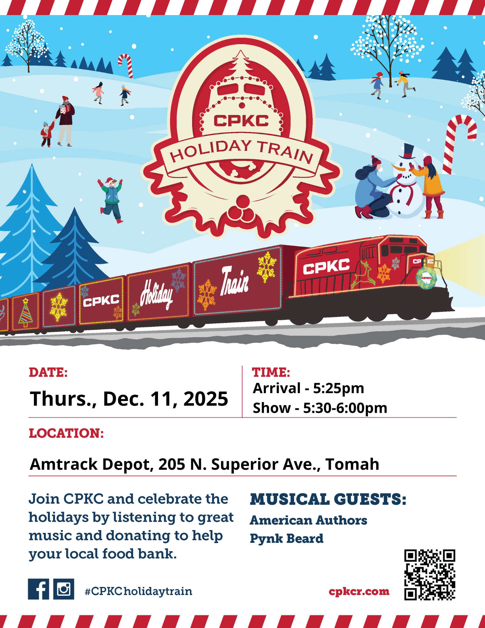Get ready for some festive fun as everyone’s favorite holiday train rolls into Tomah, Wisconsin! At each location, the CPKC Holiday Train provides a box car stage, a lineup of great musical talents, and a fantastic display of lights to delight young and old alike.