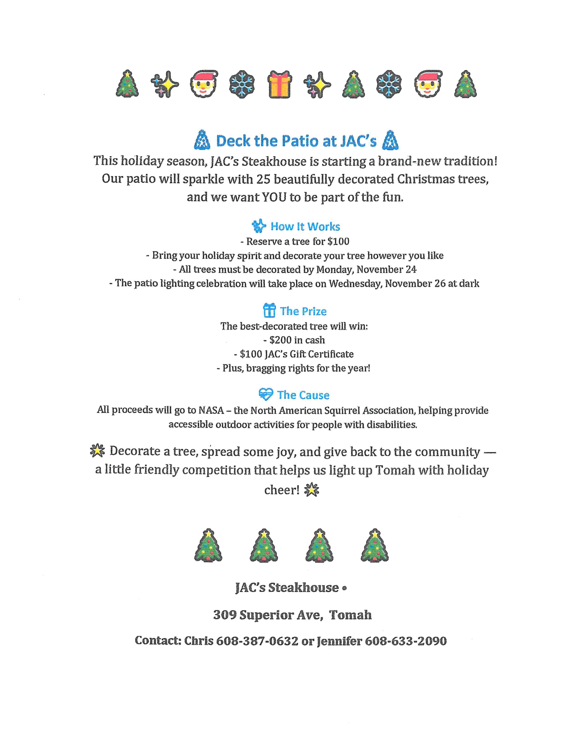 This holiday season, JAC’s Steakhouse is starting a brand-new tradition! Our patio will sparkle with 25 beautifully decorated Christmas trees, and we want YOU to be part of the fun.