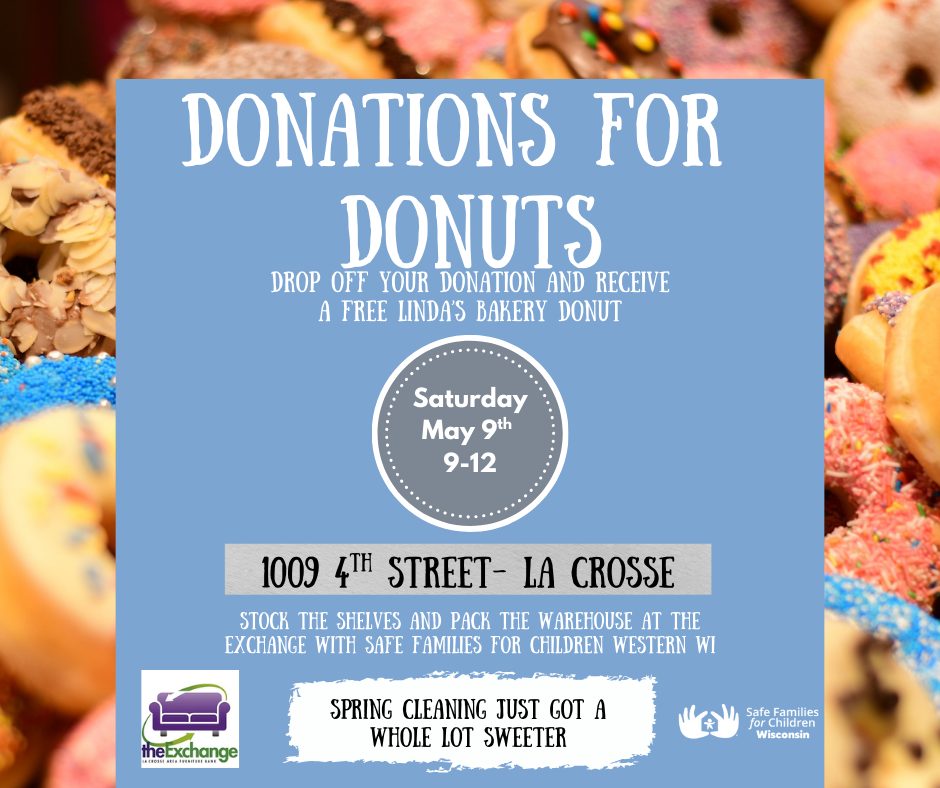 Safe Families for Children Western WI will be on site to help unload donations and hand out donuts from Linda’s Bakery. If you’re unsure whether an item is accepted — just email theexchange@shelterdevelopment.org.