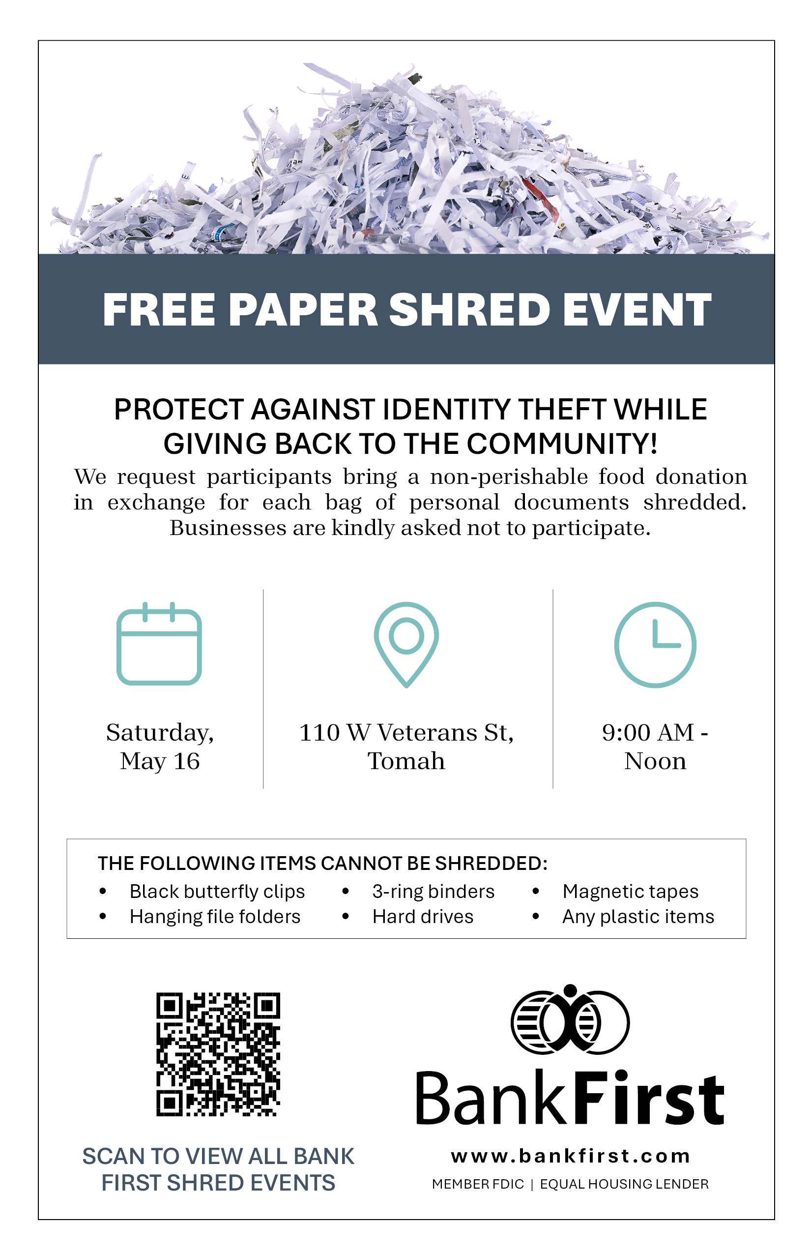 Bank First is hosting a FREE Shred Event on Saturday, May 16, 2026, from 9:00 a.m. to 12:00 Noon at Bank First Tomah, 110 W. Veterans Street.