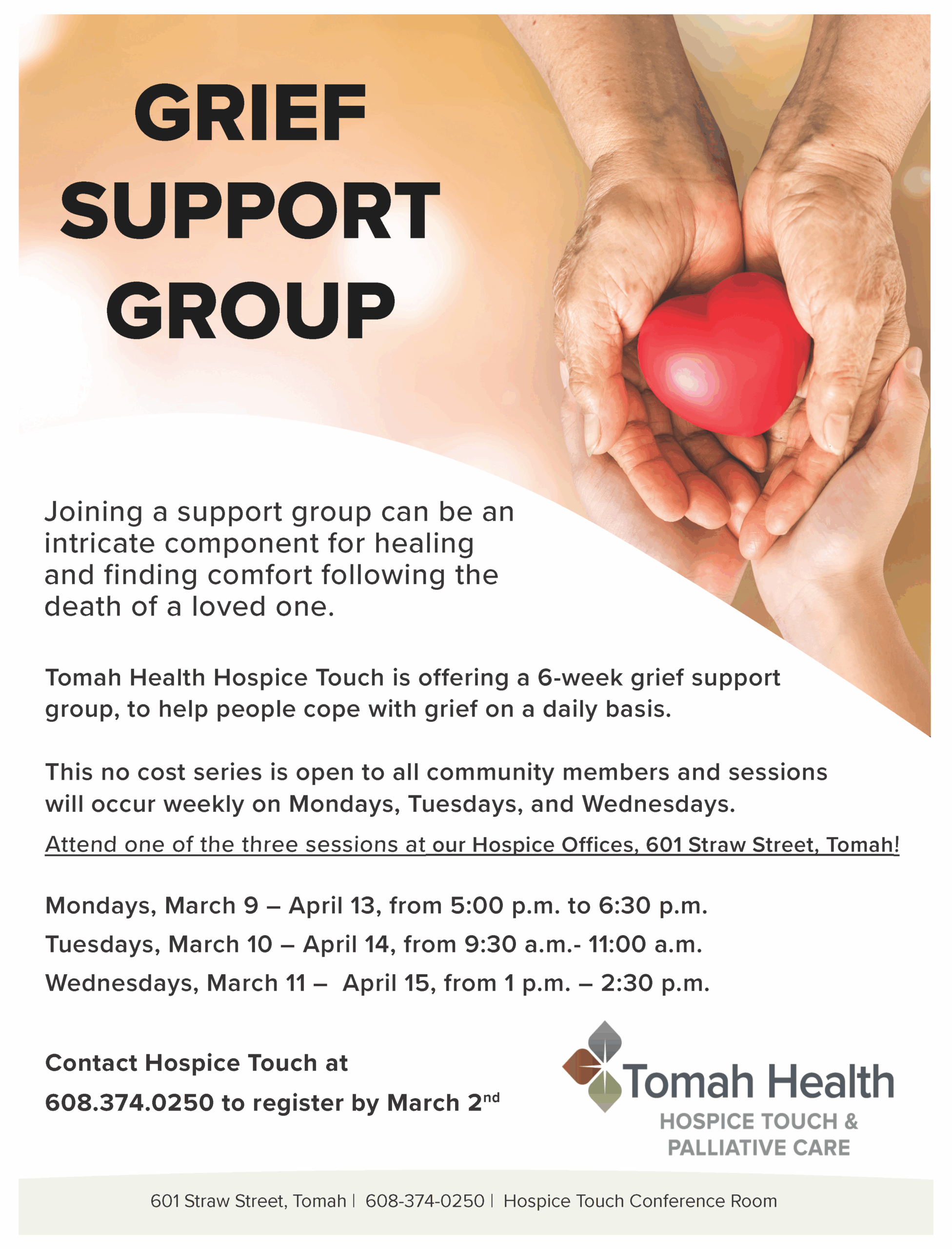 Tomah Health Hospice Touch is offering a 6-week grief support group, designed to help people cope with grief on a daily basis.