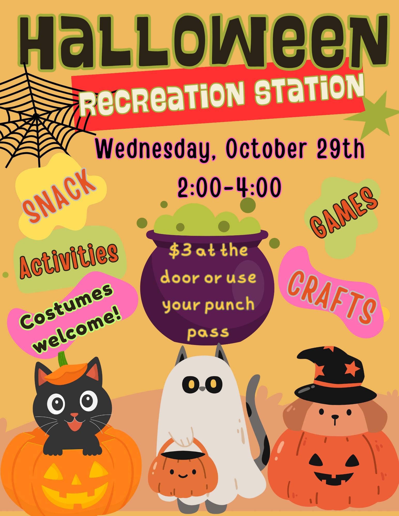 Enjoy activities, games, crafts, snacks and playtime.  Costumes are welcome!  Cost is $3 at the door or one punch per child from your punch pass card.