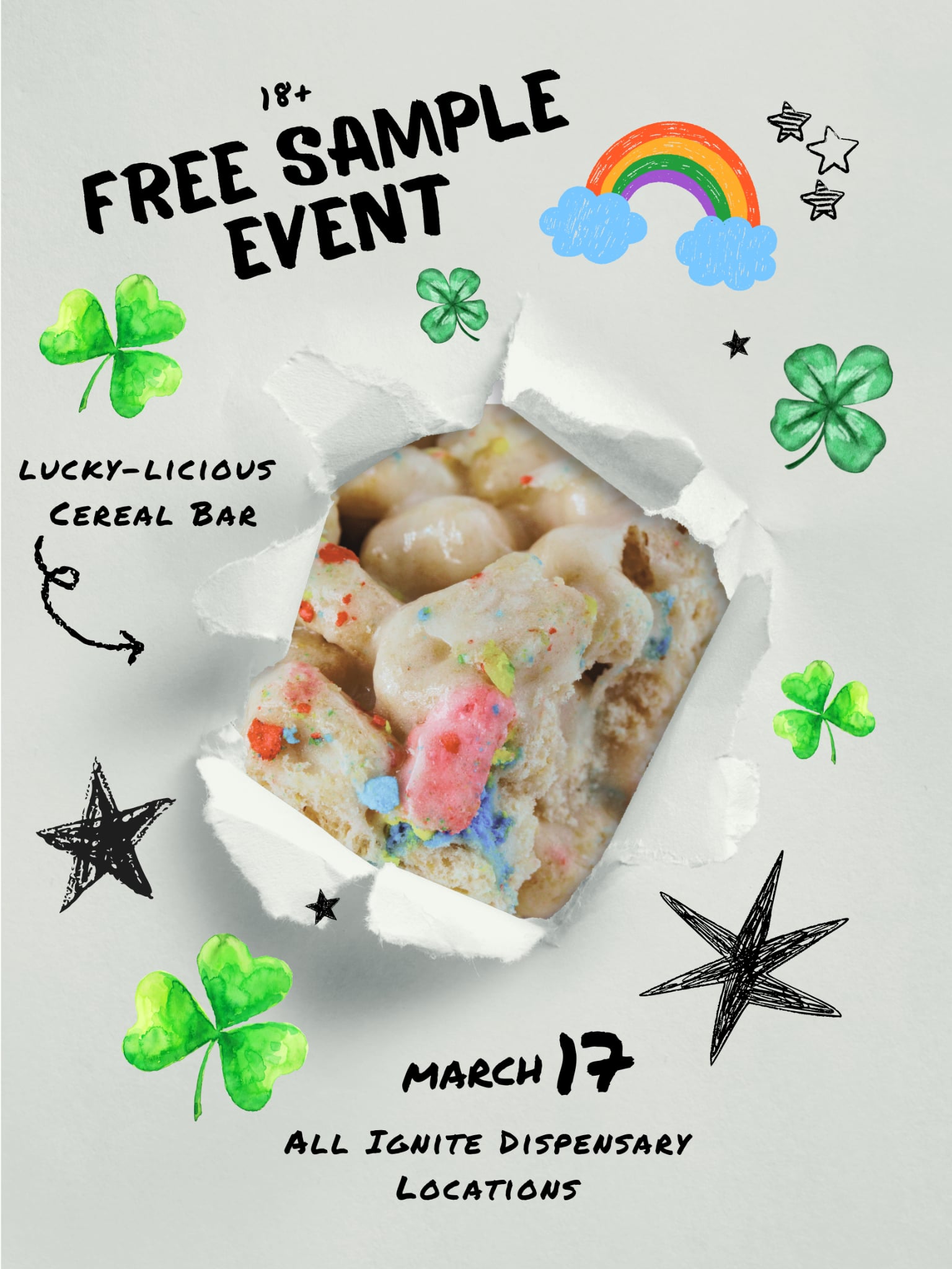 Feeling lucky? Swing by any Ignite Dispensary location on St. Patty’s Day for our Lucky-Licious Sampler Event and treat yourself to a magically delicious experience. We’re serving up festive vibes and free samples of our cereal bar that’s bursting with colorful crunch and sweet nostalgia.