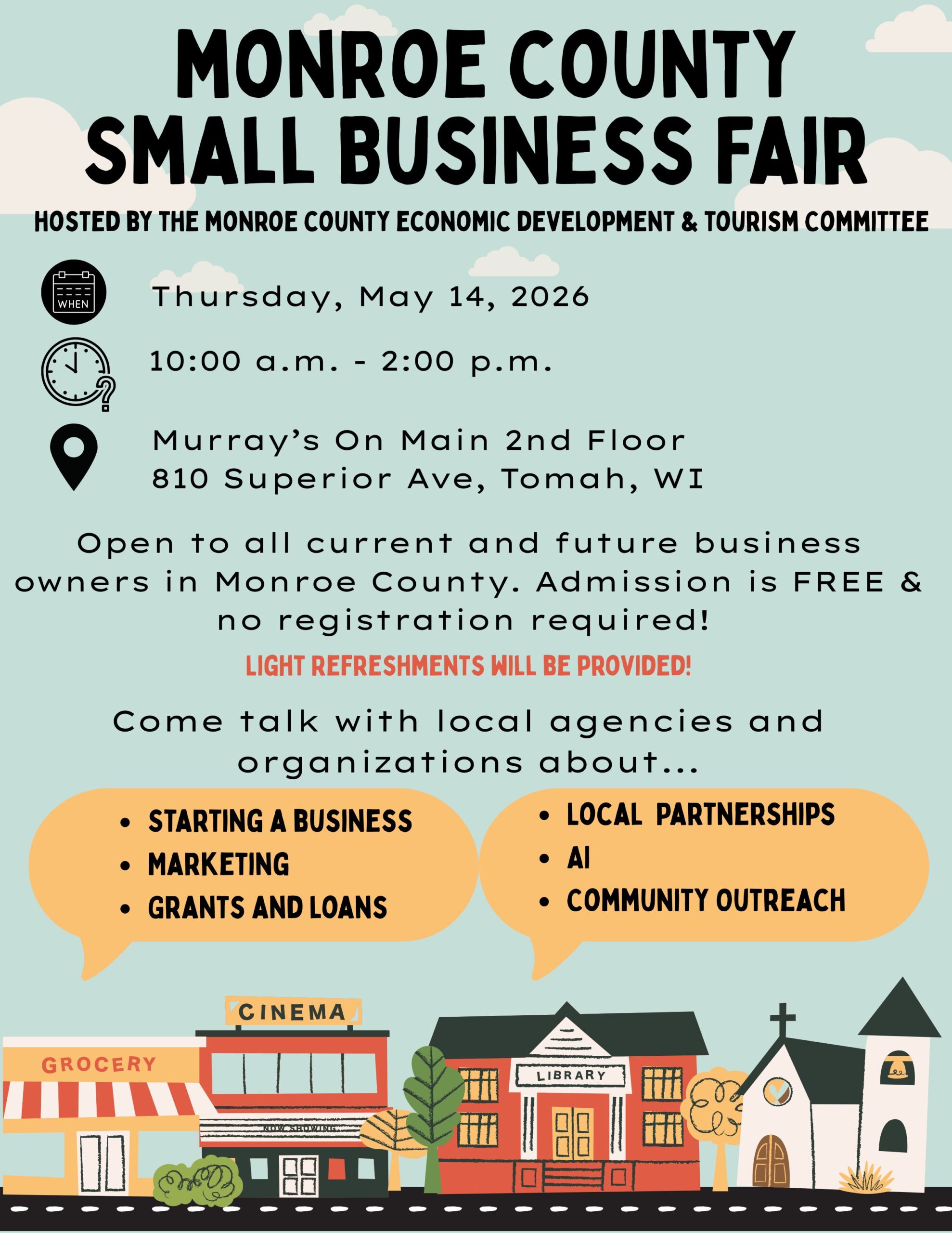 Hosted by the Monroe County Economic Development & Tourism Committee, this free event will take place on Thursday, May 14, 2026, from 10:00 a.m. to 2:00 p.m. at Murray’s on Main (2nd Floor), 810 Superior Ave, Tomah, WI.