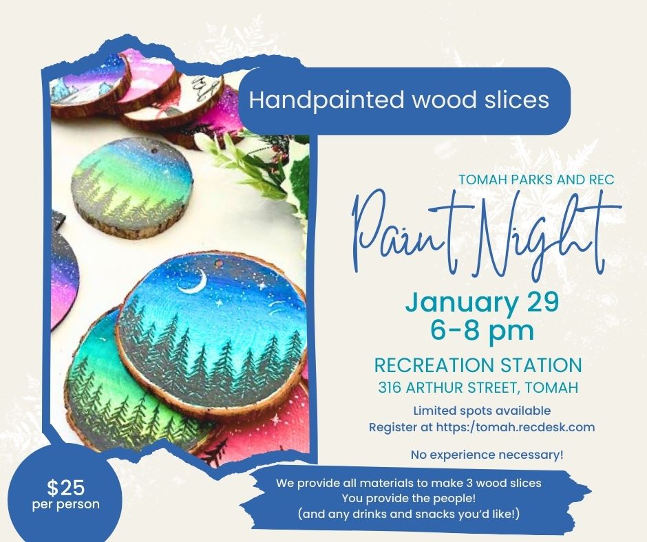 Join Tomah Parks and Recreation for a relaxing and creative Paint Night! On Wednesday, January 29, from 6–8 pm, participants will paint beautiful designs on natural wood slices—no experience necessary. All materials are provided to create three hand-painted wood slices, and step-by-step instruction will be available.