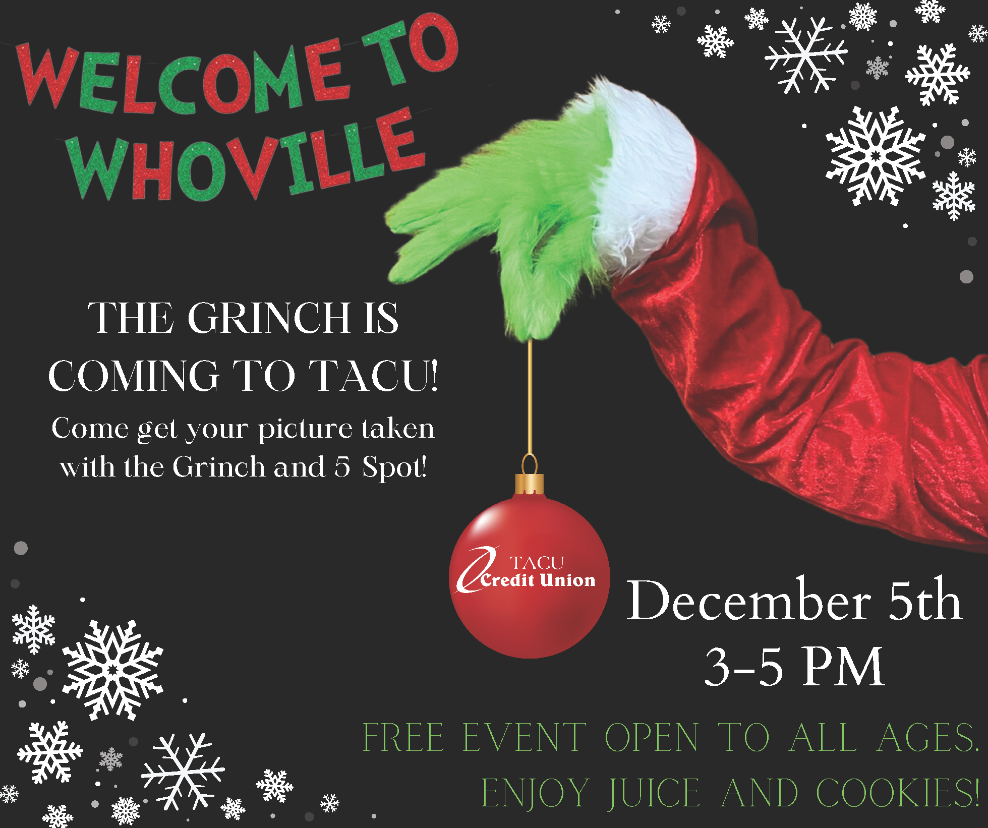 The Grinch and his friend Max (aka 5-Spot) are coming back to TACU. They will be visiting the credit union Friday, December 5th from 3PM-5PM. Stop in, get your picture taken, and enjoy some cookies and juice. Don’t forget to bring your friends! We can’t wait to see you!