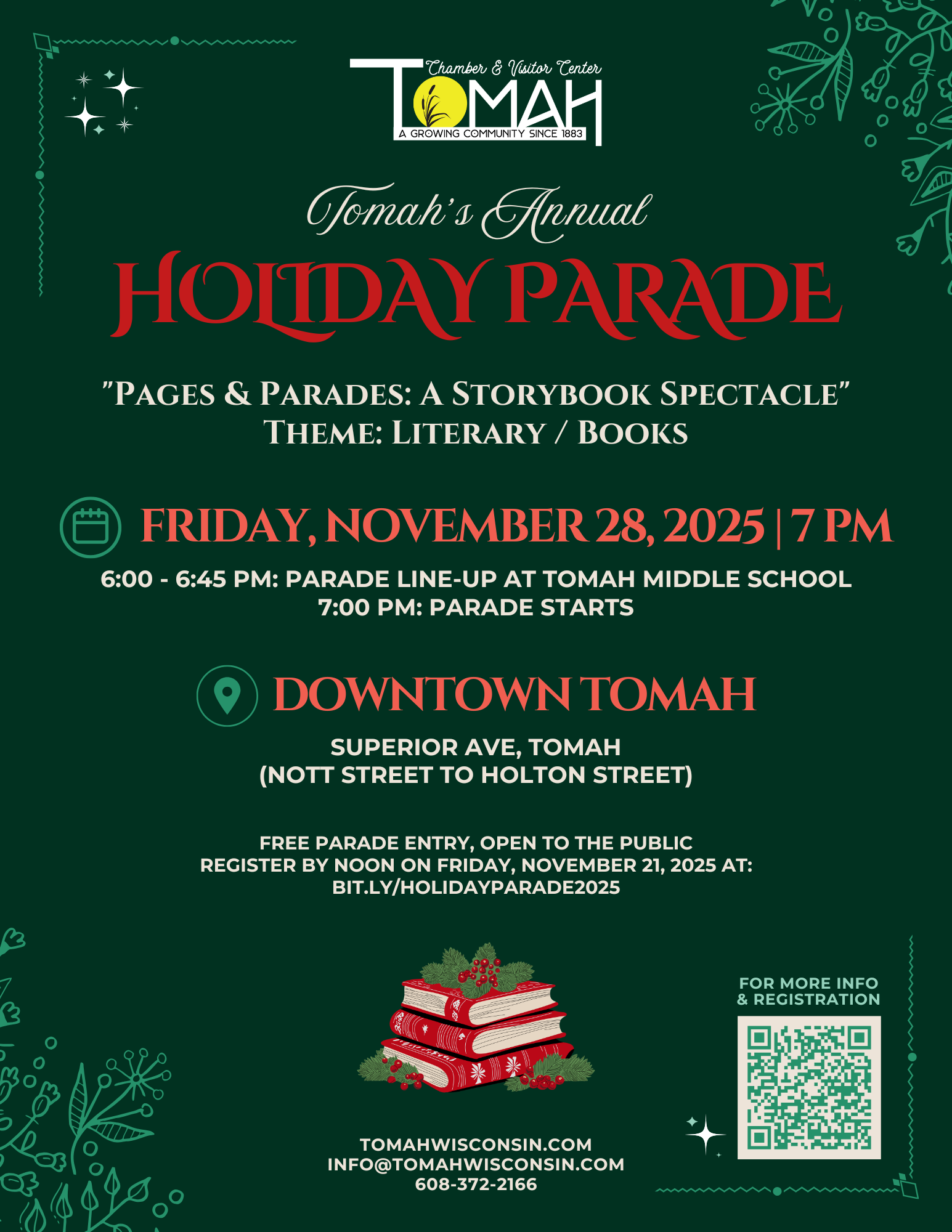 Held annually the Friday night after Thanksgiving beginning at 7pm in downtown Tomah on Superior Avenue. The parade route will travel south down the “northbound” lanes of Superior Avenue, starting at Nott Street and ending at Holton Street.