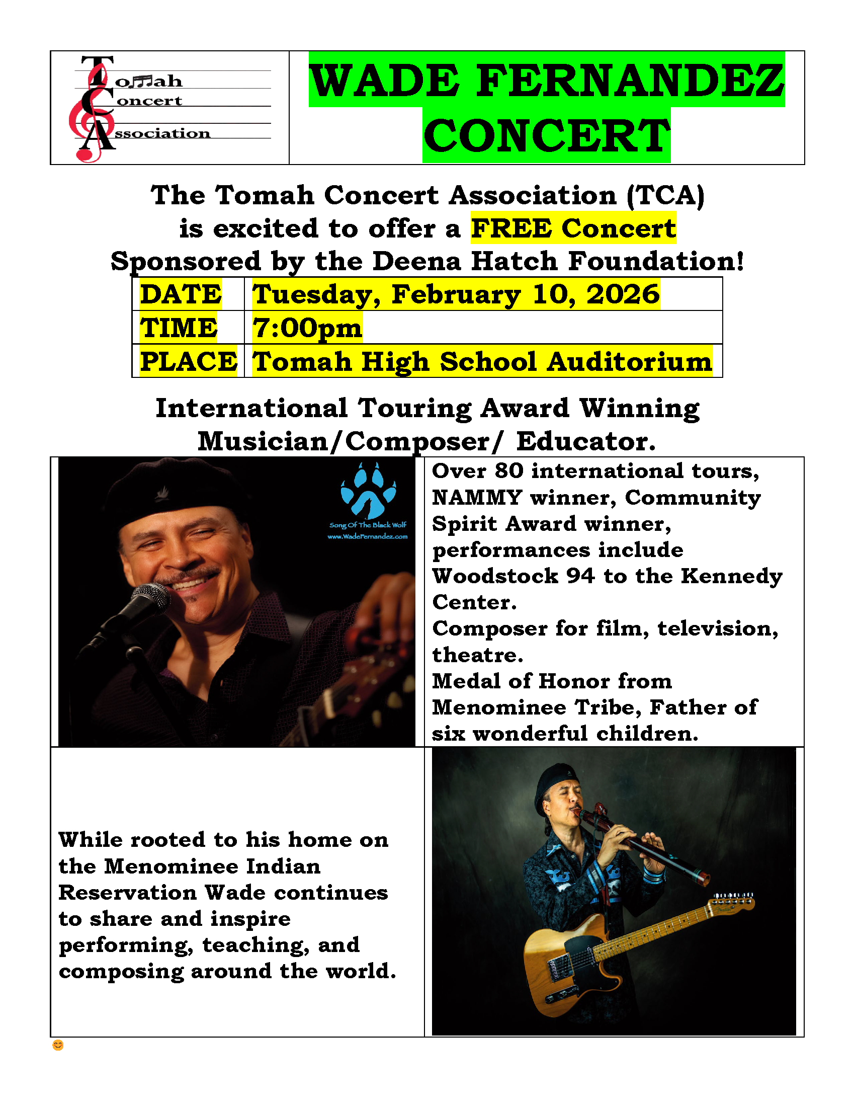 The Tomah Concert Association invites the community to enjoy a free concert by internationally acclaimed musician, composer, and educator Wade Fernandez. Sponsored by the Deena Hatch Foundation, this special evening features a powerful performance from the award-winning artist, whose career includes more than 80 international tours and performances from Woodstock ’94 to the Kennedy Center. Rooted in his Menominee heritage, Wade Fernandez shares music that inspires and connects audiences around the world.