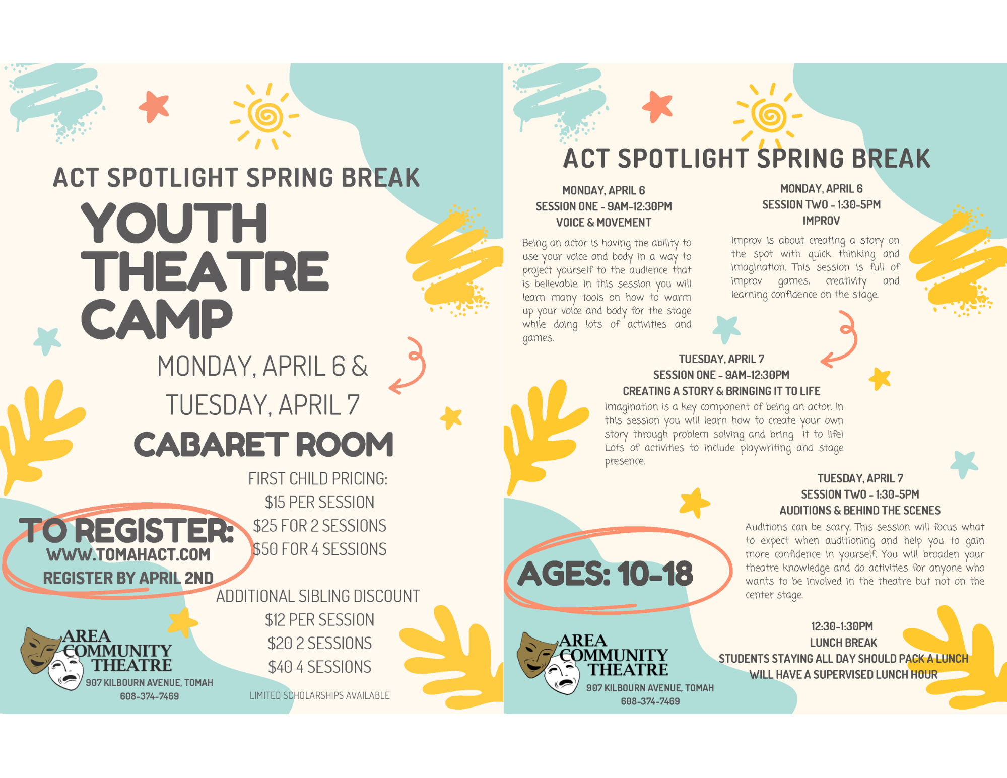 Tomah Area Community Theatre presents Youth Theatre Camp, Monday, April 6 & April 7, 2026.